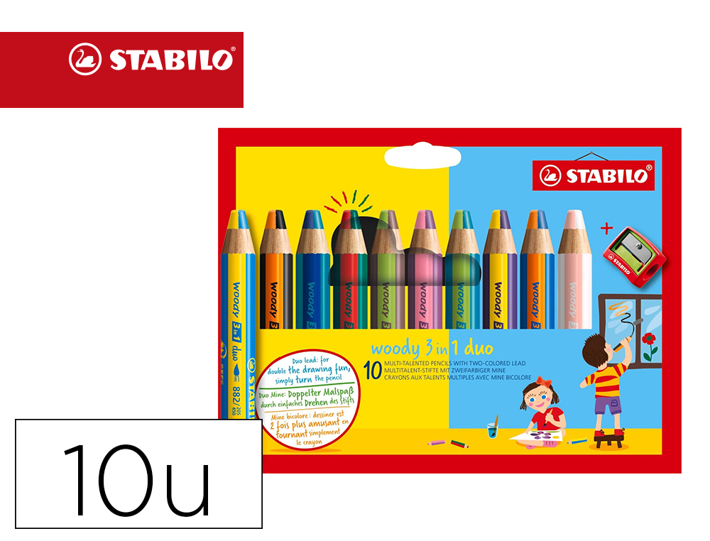 Crayon stabilo woody 3 en 1 duo multi-talents mine bicolore pointe 10mm taille-crayon inclus etui 5 unites assorties
