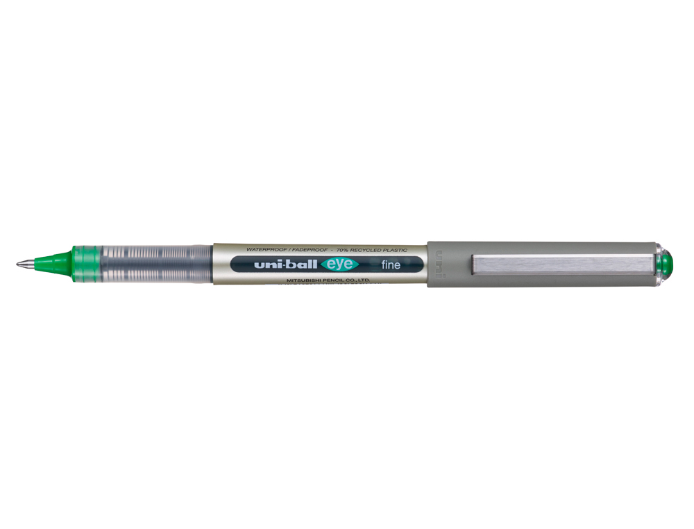 Roller uniball eye plastique recycle encre liquide ecriture moyenne pointe metal coloris turquoise