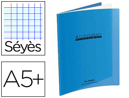 Cahier piqué conquérant classique couverture polypropylène rigide transparente 17x22cm 96 pages 90g séyès coloris bleu