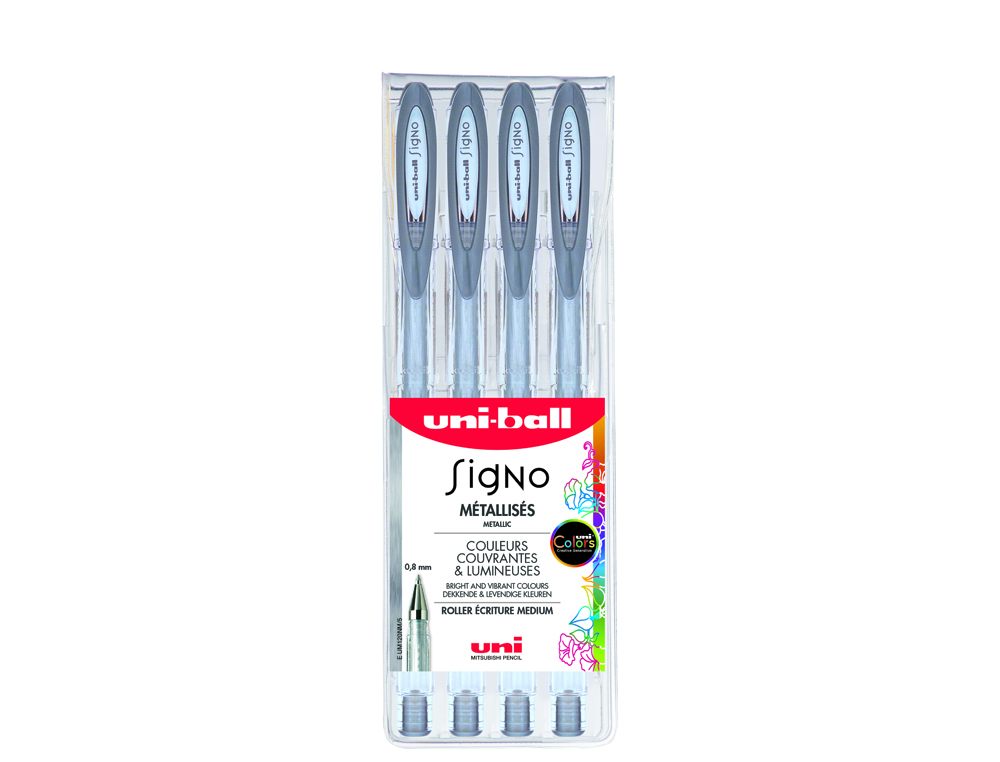 Roller uniball signo encre gel resistant pointe moyenne trace 0,7mm coloris pastel blanc pochette de 4un